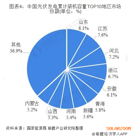 累計(jì)裝機(jī)容量方面,截至2019年第三季度,我國(guó)共有9個(gè)地區(qū)光伏發(fā)電累計(jì)裝機(jī)容量超過1000萬(wàn)千瓦。其中山東以1541萬(wàn)千瓦,排名第一,占全國(guó)總裝機(jī)容量的8.1%;江蘇和河北緊隨其后,分別以1445萬(wàn)千瓦和1363瓦千瓦占全國(guó)總裝機(jī)容量的73.6%及7.2%。